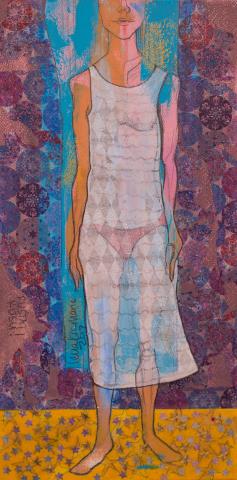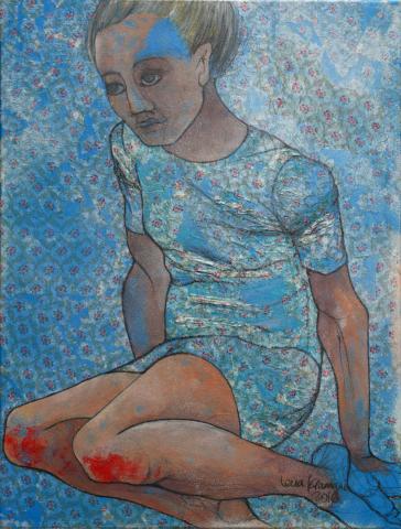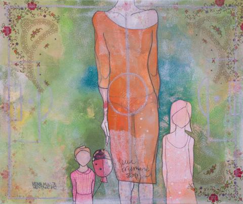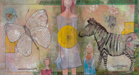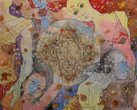 There is a children’s playground painted on the screen, but there is no noise or laughter. There are birds, as if in flight. A snail with wings, fairies, cakes and various instruments. Our hands play the instruments, our legs dance, our lips sing boisterously and then coyly whisper children’s nursery rhymes. Our heads concoct spontaneous plans, while the day concocts its own, always new and unfathomable. That is a secret.